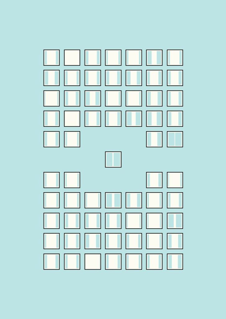 Deze keer splits ik het raster o.b.v. de twee delen met ieder 32 hoofdstukken. In de ruimte daartussen plaats ik de proloog. Het beeld staat symbool voor de holte in het bos en de bel. Daarnaast symboliseert de splitsing tussen de twee delen de rivier. De kleur, Nijlblauw, is ook geïnspireerd op de rivier.