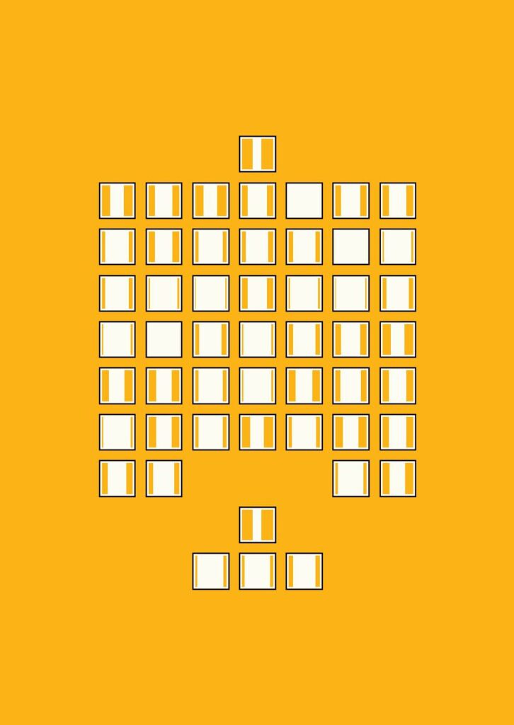 Deze keer speel ik met het raster op basis van de hoofdstukken zonder nummer: de jongen die Kraai wordt genoemd. Hiermee splits ik de hoofdstukken in twee groepen: een grote groep oven en een kleine groep daaronder. Het beeld doet denken aan een gebouw, de particuliere bibliotheek, waar een klein figuur voor staat, Kafka. De kleur oranjegeel is gebaseerd op Kafka’s visioen van het strand.